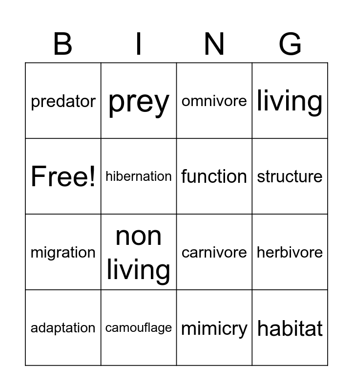 This bingo card has 16 words: camouflage, herbivore, omnivore, predator, migration, prey, carnivore, mimicry, Free!, hibernation, adaptation, living, non living, structure, function and habitat.