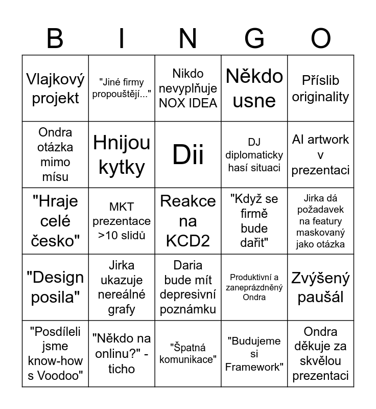 This bingo card has a free space and 24 words: Jirka ukazuje nereálné grafy, "Někdo na onlinu?" - ticho, Dii, "Posdíleli jsme know-how s Voodoo", Příslib originality, Vlajkový projekt, Ondra otázka mimo mísu, "Jiné firmy propouštějí...", "Když se firmě bude dařit", Daria bude mít depresivní poznámku, DJ diplomaticky hasí situaci, "Hraje celé česko", Produktivní a zaneprázdněný Ondra, Zvýšený paušál, Hnijou kytky, "Budujeme si Framework", Jirka dá požadavek na featury maskovaný jako otázka, Nikdo nevyplňuje NOX IDEA, AI artwork v prezentaci, MKT prezentace >10 slidů, Ondra děkuje za skvělou prezentaci, "Design posila", Někdo usne and "Špatná komunikace".