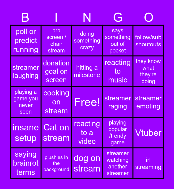 This bingo card has a free space and 24 words: Cat on stream, plushies in the background, hitting a milestone, saying brainrot terms, follow/sub shoutouts, poll or predict running, streamer laughing, brb screen / chair stream, streamer raging, reacting to a video, reacting to music, playing a game you never seen, playing popular /trendy game, Vtuber, donation goal on screen, streamer watching another streamer, streamer emoting, doing something crazy, they know what they're doing, cooking on stream, irl streaming, insane setup, says something out of pocket and dog on stream.