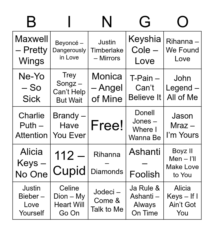 This bingo card has a free space and 50 words: Usher, Lil Jon & Ludacris – Lovers and Friends, Alicia Keys – If I Ain’t Got You, Chris Brown – Take You Down, Jodeci – Come & Talk to Me, 112 – Cupid, Aaliyah – One in a Million, Beyoncé – Dangerously in Love, SWV – Weak, Ne-Yo – So Sick, Jagged Edge – Let’s Get Married (Remix), Trey Songz – Can’t Help But Wait, Keyshia Cole – Love, Boyz II Men – I’ll Make Love to You, Ashanti – Foolish, Tyrese – Sweet Lady, Mario – Let Me Love You, Monica – Angel of Mine, Donell Jones – Where I Wanna Be, Drake – Find Your Love, Rihanna – We Found Love, Brandy – Have You Ever, Ja Rule & Ashanti – Always On Time, Maxwell – Pretty Wings, T-Pain – Can’t Believe It, Musiq Soulchild – Love, Ed Sheeran – Thinking Out Loud, John Legend – All of Me, Bruno Mars – Just the Way You Are, Justin Timberlake – Mirrors, Rihanna – Diamonds, P!nk – Just Give Me a Reason, Taylor Swift – Lover, Adele – Someone Like You, Sam Smith – Stay With Me, Celine Dion – My Heart Will Go On, Shawn Mendes – Stitches, Backstreet Boys – I Want It That Way, Nelly & Kelly Rowland – Dilemma, Bruno Mars – Versace on the Floor, Jason Mraz – I’m Yours, Leona Lewis – Bleeding Love, Maroon 5 – She Will Be Loved, Miley Cyrus – Adore You, Whitney Houston – I Will Always Love You, Justin Bieber – Love Yourself, Charlie Puth – Attention, Beyoncé – Halo, The Chainsmokers – Closer, Alicia Keys – No One and Lady Gaga & Bradley Cooper – Shallow.