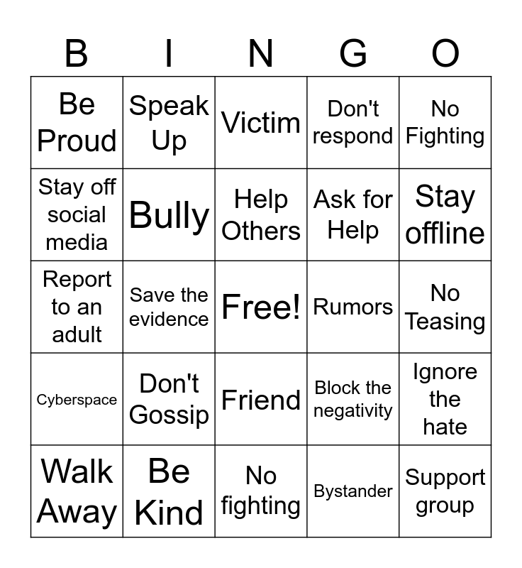 This bingo card has a free space and 24 words: Don't Gossip, Be Kind, Help Others, Walk Away, No Fighting, Be Proud, Stay off social media, Speak Up, Rumors, Friend, Ask for Help, Report to an adult, Block the negativity, Ignore the hate, Bully, Bystander, No Teasing, Victim, Stay offline, Save the evidence, Support group, Cyberspace, Don't respond and No fighting.