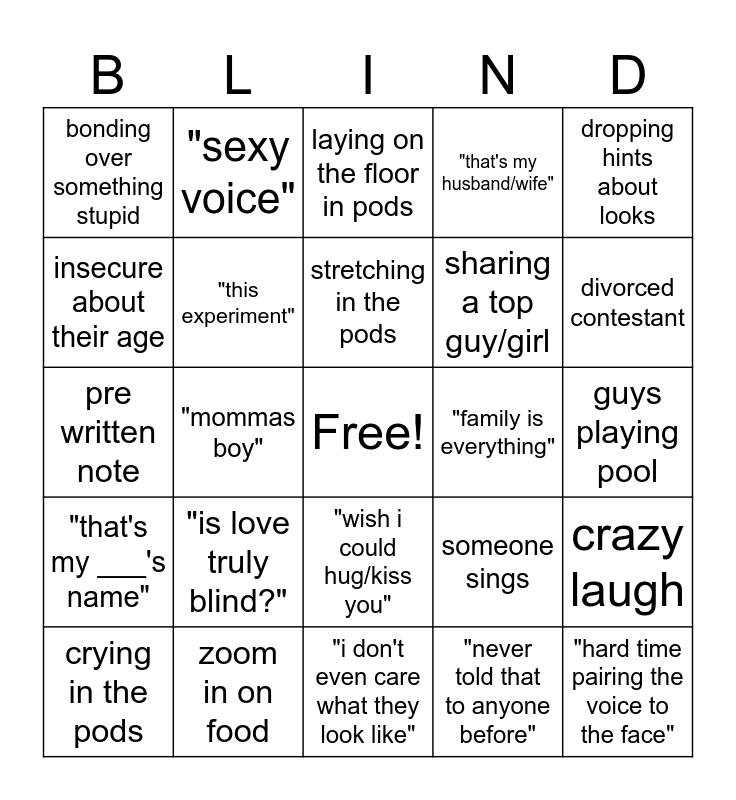 This bingo card has a free space and 24 words: "is love truly blind?", zoom in on food, stretching in the pods, crying in the pods, dropping hints about looks, bonding over something stupid, insecure about their age, "sexy voice", "family is everything", "wish i could hug/kiss you", sharing a top guy/girl, pre written note, someone sings, crazy laugh, "this experiment", "never told that to anyone before", guys playing pool, laying on the floor in pods, divorced contestant, "mommas boy", "hard time pairing the voice to the face", "that's my ___'s name", "that's my husband/wife" and "i don't even care what they look like".