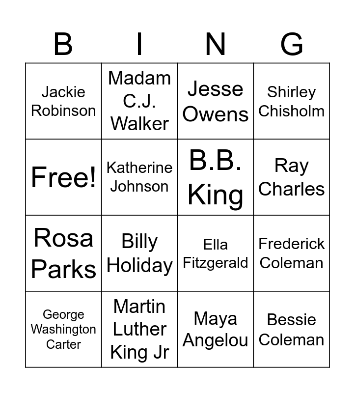 This bingo card has 16 words: Martin Luther King Jr, Frederick Coleman, Jesse Owens, Jackie Robinson, Rosa Parks, Madam C.J. Walker, Ella Fitzgerald, Maya Angelou, Free!, Katherine Johnson, George Washington Carter, Shirley Chisholm, Billy Holiday, Ray Charles, B.B. King and Bessie Coleman.