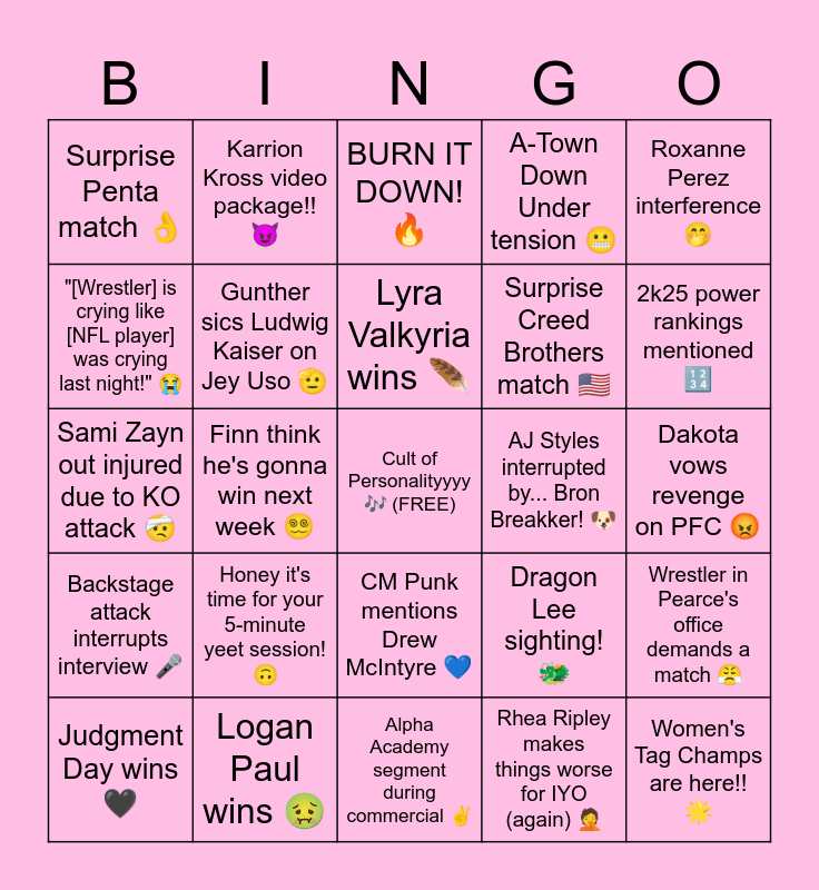 This bingo card has a free space and 24 words: Honey it's time for your 5-minute yeet session! π, Logan Paul wins π€’, Lyra Valkyria wins πͺΆ, Judgment Day wins π€, Roxanne Perez interference π€, Surprise Penta match π, "[Wrestler] is crying like [NFL player] was crying last night!" π, Karrion Kross video package!! π, AJ Styles interrupted by... Bron Breakker! πΆ, CM Punk mentions Drew McIntyre π, Surprise Creed Brothers match πΊπΈ, Sami Zayn out injured due to KO attack π€, Dragon Lee sighting! π², Wrestler in Pearce's office demands a match π€, Gunther sics Ludwig Kaiser on Jey Uso π«‘, Rhea Ripley makes things worse for IYO (again) π€¦, Dakota vows revenge on PFC π‘, BURN IT DOWN! π₯, 2k25 power rankings mentioned π’, Finn think he's gonna win next week π΅βπ«, Women's Tag Champs are here!! π, Backstage attack interrupts interview π€, A-Town Down Under tension π¬ and Alpha Academy segment during commercial βοΈ.