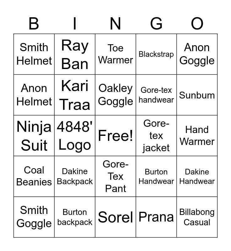 This bingo card has a free space and 24 words: Dakine Backpack, Burton backpack, Oakley Goggle, Smith Goggle, Anon Goggle, Smith Helmet, Anon Helmet, Ray Ban, Gore-tex jacket, Gore-Tex Pant, Gore-tex handwear, Ninja Suit, Burton Handwear, Dakine Handwear, Kari Traa, Prana, Hand Warmer, Toe Warmer, Sunbum, 4848' Logo, Billabong Casual, Coal Beanies, Blackstrap and Sorel.