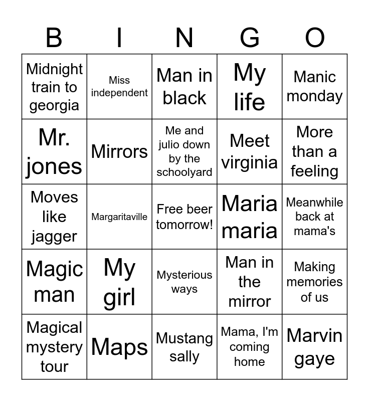 This bingo card has a free space and 45 words: Make you miss me, Marvin gaye, Magic, Magical mystery tour, Makes me wonder, Mama, I'm coming home, Man in black, Maneater, Manic monday, Maps, My life, Maria maria, Mysterious ways, My girl, My hero, Mustang sally, My boyfriend's back, Moves like jagger, Mony mony, More than a feeling, Miss independent, Misunderstanding, Miami, Midnight train to georgia, Mine would be you, Meanwhile back at mama's, My house, MMMbop, Man in the mirror, Magic man, Make me smile, Making memories of us, Mama's broken heart, Mamma mia, Man! I feel like a woman, Margaritaville, Money for nothing, Mary jane's last dance, Mayberry, Me and julio down by the schoolyard, Mr. jones, Meet virginia, Men in black, Mirrors and Mississippi queen.
