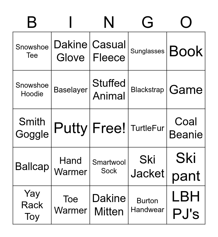 This bingo card has a free space and 24 words: Hand Warmer, Toe Warmer, Stuffed Animal, Yay Rack Toy, Book, Snowshoe Tee, Snowshoe Hoodie, Dakine Glove, TurtleFur, Smartwool Sock, Blackstrap, Smith Goggle, Ski Jacket, Ski pant, Baselayer, Burton Handwear, Coal Beanie, Casual Fleece, Game, Putty, LBH PJ's, Ballcap, Sunglasses and Dakine Mitten.