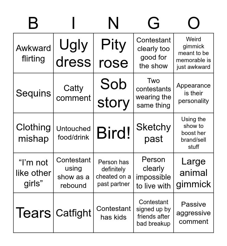 This bingo card has a free space and 25 words: Contestant using show as a rebound, Contestant has kids, Sob story, Tears, Weird gimmick meant to be memorable is just awkward, Awkward flirting, Sequins, Ugly dress, Sketchy past, Person has definitely cheated on a past partner, Two contestants wearing the same thing, Clothing mishap, Person clearly impossible to live with, Large animal gimmick, Catty comment, Influencer, Using the show to boost her brand/sell stuff, Pity rose, Appearance is their personality, Untouched food/drink, Passive aggressive comment, Catfight, “I’m not like other girls”, Contestant clearly too good for the show and Contestant signed up by friends after bad breakup.