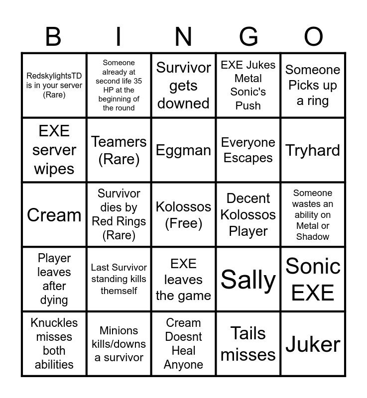 This bingo card has a free space and 64 words: Failed Spindash, Spindash spammer, Metal Sonic, Tails misses, Targetter, Turrents get Destroyed, Someone already at second life 35 HP at the beginning of the round, Someone gets grabbed, Decent Kolossos Player, Someone Rages, Player leaves after dying, Minions (Survivor EXE's), Sally, Someone Picks up a ring, Good Knuckles, Teamers (Rare), Eggman, EXE Jukes Metal Sonic's Push, Last Survivor Standing gives up, EXE server wipes, Minions kills/downs a survivor, EXE leaves the game, Everyone Escapes, Juker, Someone complains about hitboxes, Tails Doll, Regular Shield Sally, Metal Sonic gets dragged, Someone wastes an ability on Metal or Shadow, Knuckles misses both abilities, Dead Body easter egg, Metal Sonic Self Destructs, You get targeted, Kind and Fair, Cream, EXE skips, Rouge (Rare), Survivor/EXE gets hit by the Tornado/Plane, Survivor dies by Grab ability, RedskylightsTD is in your server (Rare), Survivor dies by Red Rings (Rare), Cream Doesnt Heal Anyone, Cream heals someone, Player leaves the game for no reason, AFK Player, Last Survivor standing kills themself, Amy Hits EXE with hammer throw, Tails lands a hit on EXE with arm canon, Tryhard, Shadow, Tails, Blaze, Silver, Sonic EXE, Amy, Knuckles, Survivor gets downed, Survivor dies at final 80, Survivor body blocks another survivor, Dead body in the game over camera, Survivor sells the team, Blaze misses a heatwave and takes damage, Fire Tornado combo and Someone makes a non Sonic game reference.