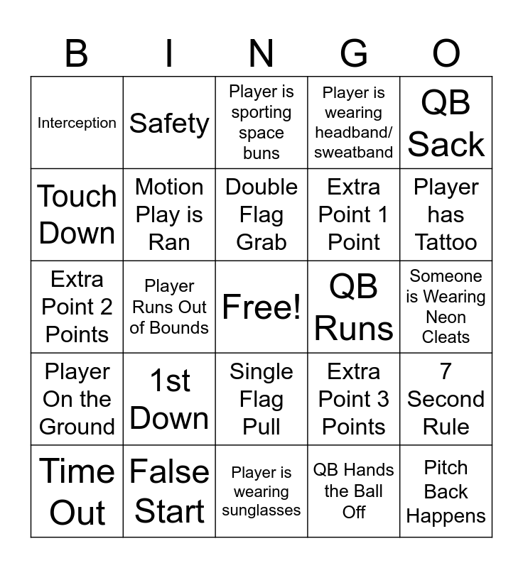 This bingo card has a free space and 24 words: 1st Down, False Start, Double Flag Grab, Time Out, QB Sack, Interception, Touch Down, Safety, QB Runs, Single Flag Pull, Extra Point 1 Point, Extra Point 2 Points, Extra Point 3 Points, 7 Second Rule, Motion Play is Ran, QB Hands the Ball Off, Someone is Wearing Neon Cleats, Player is sporting space buns, Player has Tattoo, Player Runs Out of Bounds, Pitch Back Happens, Player On the Ground, Player is wearing headband/ sweatband and Player is wearing sunglasses.