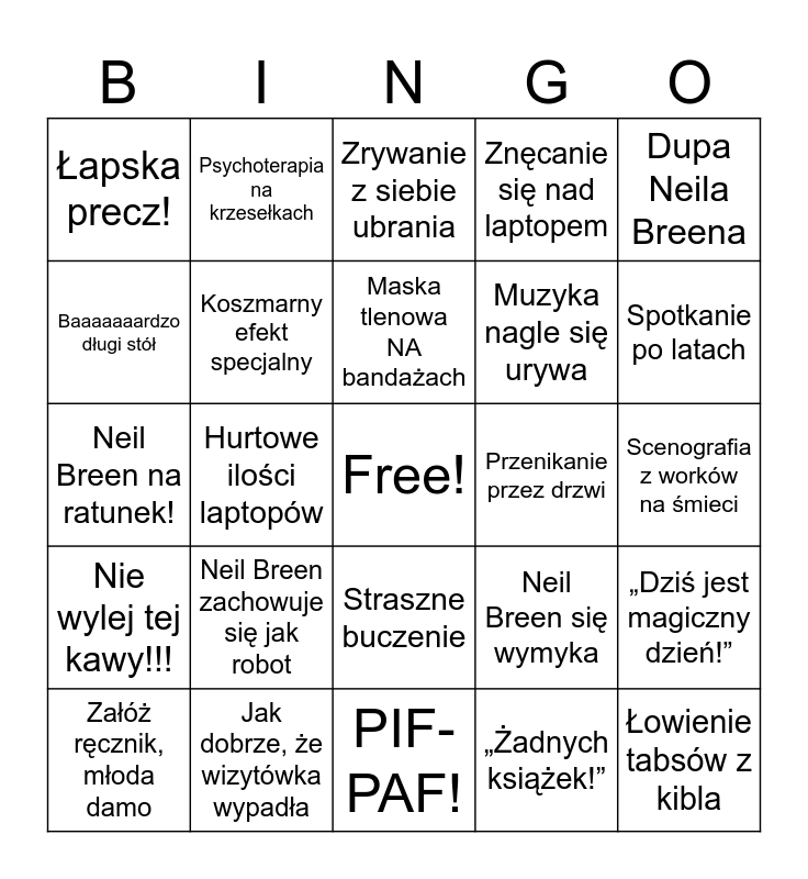 This bingo card has a free space and 37 words: Wielka księga, Obracająca się czaszka, Okropna gra aktorska, Koszmarny efekt specjalny, „Dziś jest magiczny dzień!”, Neil Breen zachowuje się jak robot, Maska tlenowa NA bandażach, Niepotrzebnie długa scena, Dupa Neila Breena, Paskudny seks pod prysznicem, Hurtowe ilości laptopów, Znęcanie się nad laptopem, Łowienie tabsów z kibla, Scenografia z worków na śmieci, Baaaaaaardzo długi stół, Nie wylej tej kawy!!!, Cycki!, Zrywanie z siebie ubrania, Straszne buczenie, Przenikanie przez drzwi, Łapska precz!, Spotkanie po latach, Załóż ręcznik, młoda damo, PIF-PAF!, Oscarowa scena Neila Breena, „Żadnych książek!”, Psychoterapia na krzesełkach, Kaczuchy albo gęsi, Pomoczone łóżko, Seksy w plenerze, Talerz zieleniny spada z notatek, Jak dobrze, że wizytówka wypadła, Neil Breen na ratunek!, Rzeczy w domu same się ruszają, Neil Breen się wymyka, Muzyka nagle się urywa and Krew na czarnych lakierkach.