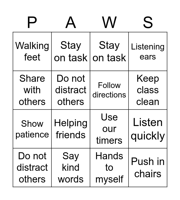 This bingo card has 16 words: Say kind words, Listen quickly, Stay on task, Walking feet, Show patience, Stay on task, Use our timers, Hands to myself, Share with others, Do not distract others, Do not distract others, Listening ears, Helping friends, Keep class clean, Follow directions and Push in chairs.