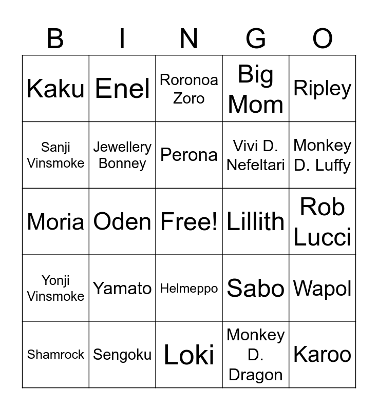 This bingo card has a free space and 24 words: Yamato, Sengoku, Perona, Shamrock, Ripley, Kaku, Sanji Vinsmoke, Enel, Lillith, Helmeppo, Vivi D. Nefeltari, Moria, Sabo, Wapol, Jewellery Bonney, Monkey D. Dragon, Rob Lucci, Roronoa Zoro, Monkey D. Luffy, Oden, Karoo, Yonji Vinsmoke, Big Mom and Loki.