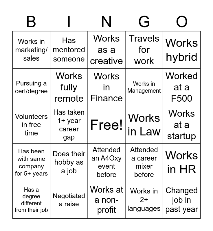 This bingo card has a free space and 34 words: Has worked abroad, Works in 2+ languages, Has changed careers before, Works in Entertainment, Has been with same company for 5+ years, Works fully remote, Works hybrid, Has a degree different from their job, Has mentored someone, Has been a mentee, Works in Finance, Works as a creative, Works in Tech, Works in Healthcare, Works in Law, Worked at a F500, Negotiated a raise, Volunteers in free time, Does their hobby as a job, Attended a career mixer before, Attended an A4Oxy event before, Promoted in the past year, Works in marketing/ sales, Works at a startup, Works at a non-profit, Changed job in past year, Travels for work, Works in Education, Works in Management, Pursuing a cert/degree, Works in government/ politics, Has taken 1+ year career gap, Works in HR and Works in Customer Services.
