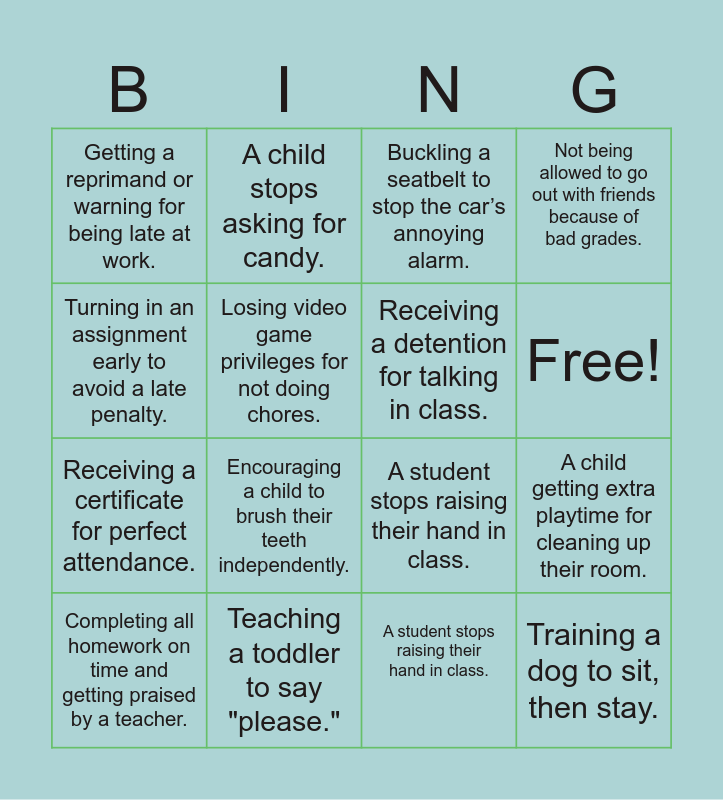 This bingo card has 17 words: A student stops raising their hand in class., Completing all homework on time and getting praised by a teacher., Buckling a seatbelt to stop the car’s annoying alarm., Getting a reprimand or warning for being late at work., Encouraging a child to brush their teeth independently., Not being allowed to go out with friends because of bad grades., A child getting extra playtime for cleaning up their room., Receiving a detention for talking in class., Free!, Losing video game privileges for not doing chores., Teaching a toddler to say "please.", A student stops raising their hand in class., Turning in an assignment early to avoid a late penalty., A child stops asking for candy., Receiving a certificate for perfect attendance., Taking away dessert for not finishing dinner. and Training a dog to sit, then stay..