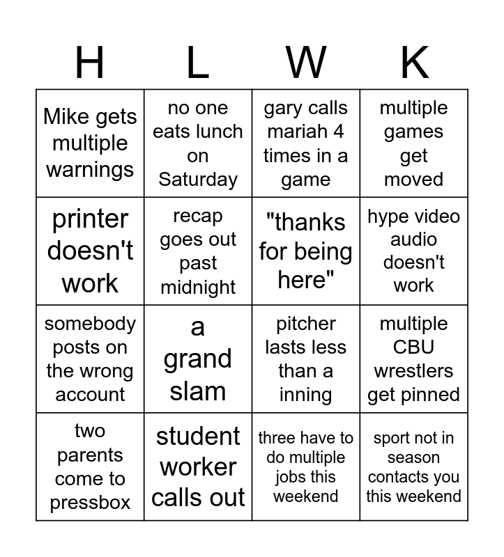 This bingo card has 16 words: student worker calls out, multiple CBU wrestlers get pinned, gary calls mariah 4 times in a game, Mike gets multiple warnings, somebody posts on the wrong account, no one eats lunch on Saturday, pitcher lasts less than a inning, three have to do multiple jobs this weekend, printer doesn't work, recap goes out past midnight, two parents come to pressbox, multiple games get moved, a grand slam, hype video audio doesn't work, "thanks for being here" and sport not in season contacts you this weekend.