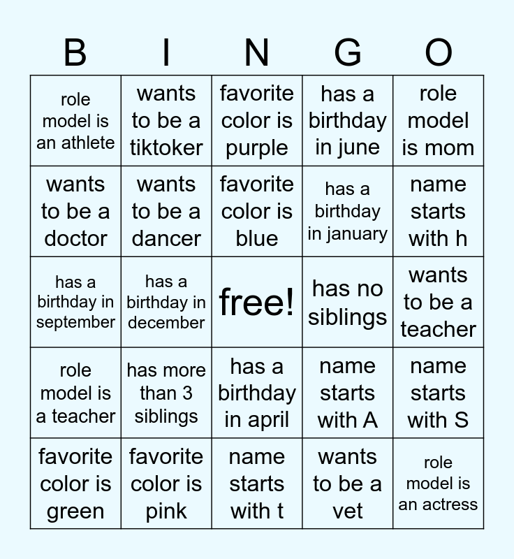 This bingo card has a free space and 24 words: has more than 3 siblings, favorite color is pink, favorite color is blue, favorite color is green, role model is mom, role model is an athlete, wants to be a doctor, wants to be a tiktoker, has no siblings, has a birthday in april, has a birthday in january, has a birthday in september, name starts with A, name starts with S, wants to be a dancer, wants to be a vet, wants to be a teacher, favorite color is purple, name starts with h, has a birthday in december, role model is an actress, role model is a teacher, has a birthday in june and name starts with t.