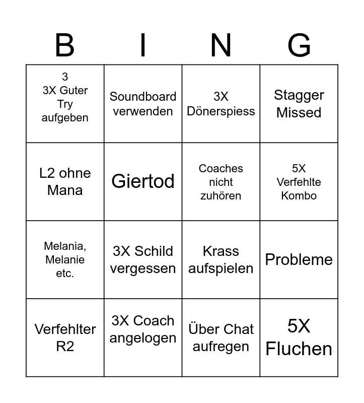This bingo card has 16 words: 3X Coach angelogen, Probleme, 3X Dönerspiess, 3 3X Guter Try aufgeben, Melania, Melanie etc., Soundboard verwenden, Krass aufspielen, Über Chat aufregen, L2 ohne Mana, Giertod, Verfehlter R2, Stagger Missed, 3X Schild vergessen, 5X Verfehlte Kombo, Coaches nicht zuhören and 5X Fluchen.