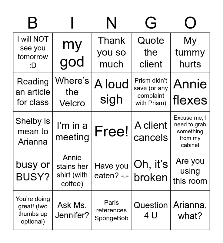 This bingo card has a free space and 35 words: Coffee or caffeine alternative, Laughing heard from the workroom, I need batteries, Where’s the Velcro, Have you eaten? -.-, Quote the client, Reading an article for class, Forgot to ask for coverage, A loud sigh, Ms. Jennifer’s heels, Shelby is mean to Arianna, My tummy hurts, We love Tessa, Restroom break text, I will NOT see you tomorrow :D, A client cancels, Question 4 U, I’m in a meeting, busy or BUSY?, Arianna, what?, Oh, it’s broken, You’re doing great! (two thumbs up optional), Are you using this room, Ask Ms. Jennifer?, Thank you so much, Annie flexes, Printer error (user or machine error), Loukia, Prism didn’t save (or any complaint with Prism), Excuse me, I need to grab something from my cabinet, Harry Potter closet, Paris references SpongeBob, Annie stains her shirt (with coffee), my god and JOONHO!!!!.