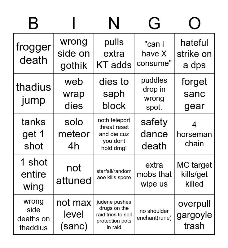 This bingo card has a free space and 24 words: not attuned, not max level (sanc), dies to saph block, wrong side deaths on thaddius, hateful strike on a dps, frogger death, thadius jump, wrong side on gothik, safety dance death, starfall/random aoe kills spore, puddles drop in wrong spot., tanks get 1 shot, extra mobs that wipe us, MC target kills/get killed, web wrap dies, no shoulder enchant(rune), 4 horseman chain, pulls extra KT adds, forget sanc gear, solo meteor 4h, overpull gargoyle trash, 1 shot entire wing, "can i have X consume" and judene pushes drugs on the raid tries to sell protection pots in raid.