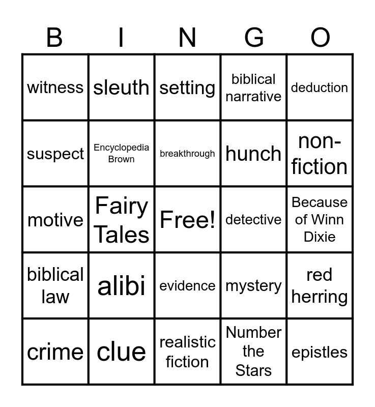 This bingo card has a free space and 24 words: alibi, clue, breakthrough, crime, deduction, witness, suspect, sleuth, detective, evidence, hunch, motive, mystery, red herring, Encyclopedia Brown, Number the Stars, Because of Winn Dixie, setting, non-fiction, Fairy Tales, epistles, biblical law, biblical narrative and realistic fiction.