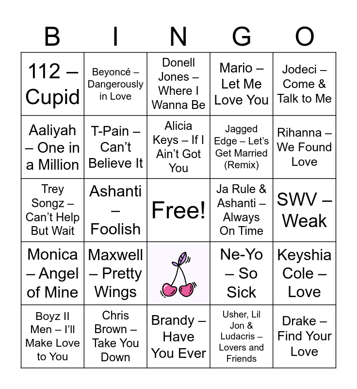 This bingo card has 1 images, a free space and 25 words: Usher, Lil Jon & Ludacris – Lovers and Friends, Alicia Keys – If I Ain’t Got You, Chris Brown – Take You Down, Jodeci – Come & Talk to Me, 112 – Cupid, Aaliyah – One in a Million, Beyoncé – Dangerously in Love, SWV – Weak, Ne-Yo – So Sick, Jagged Edge – Let’s Get Married (Remix), Trey Songz – Can’t Help But Wait, Keyshia Cole – Love, Boyz II Men – I’ll Make Love to You, Ashanti – Foolish, Tyrese – Sweet Lady, Mario – Let Me Love You, Monica – Angel of Mine, Donell Jones – Where I Wanna Be, Drake – Find Your Love, Rihanna – We Found Love, Brandy – Have You Ever, Ja Rule & Ashanti – Always On Time, Maxwell – Pretty Wings, T-Pain – Can’t Believe It and Musiq Soulchild – Love.