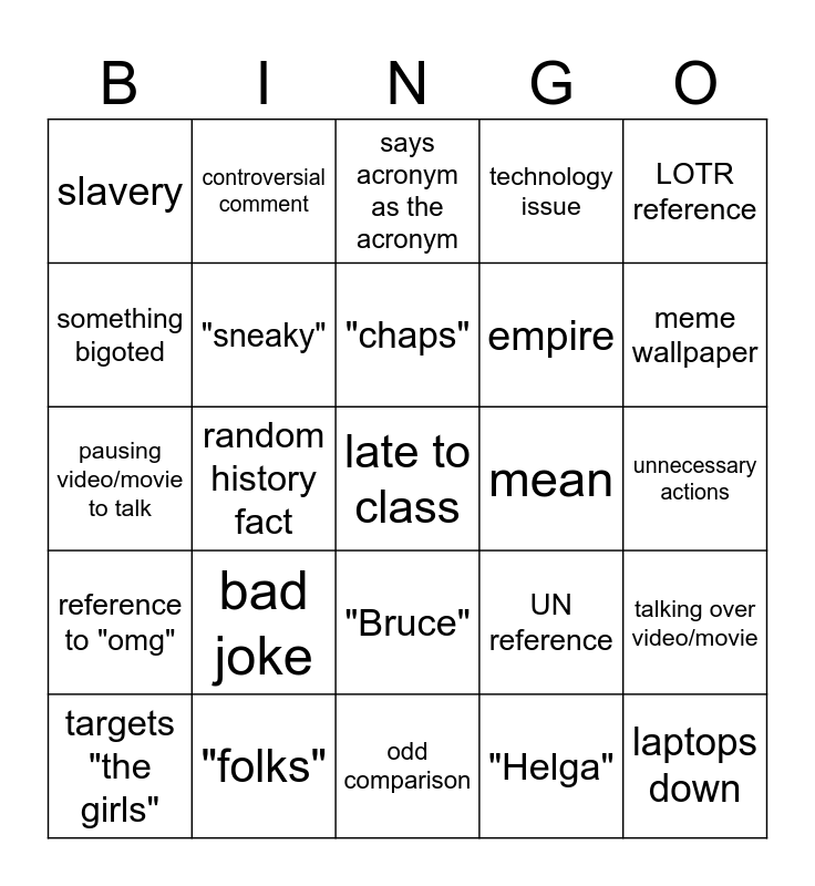 This bingo card has a free space and 26 words: "Bruce", "Helga", "chaps", "folks", LOTR reference, slavery, something bigoted, controversial comment, unnecessary actions, UN reference, empire, pausing video/movie to talk, talking over video/movie, targets "the girls", random history fact, random story, technology issue, reference to "omg", says acronym as the acronym, laptops down, meme wallpaper, odd comparison, mean, bad joke, "sneaky" and injury.