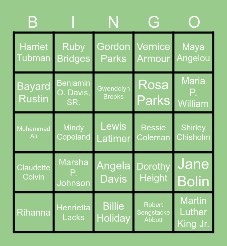 This bingo card has a free space and 24 words: Rihanna, Marsha P. Johnson, Gwendolyn Brooks, Robert Sengstacke Abbott, Maya Angelou, Harriet Tubman, Ruby Bridges, Gordon Parks, Bessie Coleman, Shirley Chisholm, Muhammad Ali, Benjamin O. Davis, SR., Dorothy Height, Jane Bolin, Bayard Rustin, Henrietta Lacks, Billie Holiday, Vernice Armour, Maria P. William, Claudette Colvin, Mindy Copeland, Angela Davis, Rosa Parks and Martin Luther King Jr..