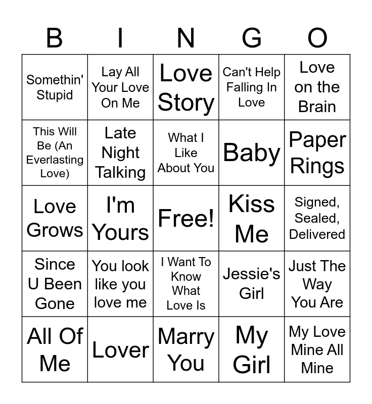 This bingo card has a free space and 24 words: You look like you love me, Lover, What I Like About You, All Of Me, Love on the Brain, Somethin' Stupid, This Will Be (An Everlasting Love), Lay All Your Love On Me, Kiss Me, I Want To Know What Love Is, Baby, Love Grows, Jessie's Girl, Just The Way You Are, Late Night Talking, My Girl, Signed, Sealed, Delivered, Love Story, Paper Rings, I'm Yours, My Love Mine All Mine, Since U Been Gone, Can't Help Falling In Love and Marry You.