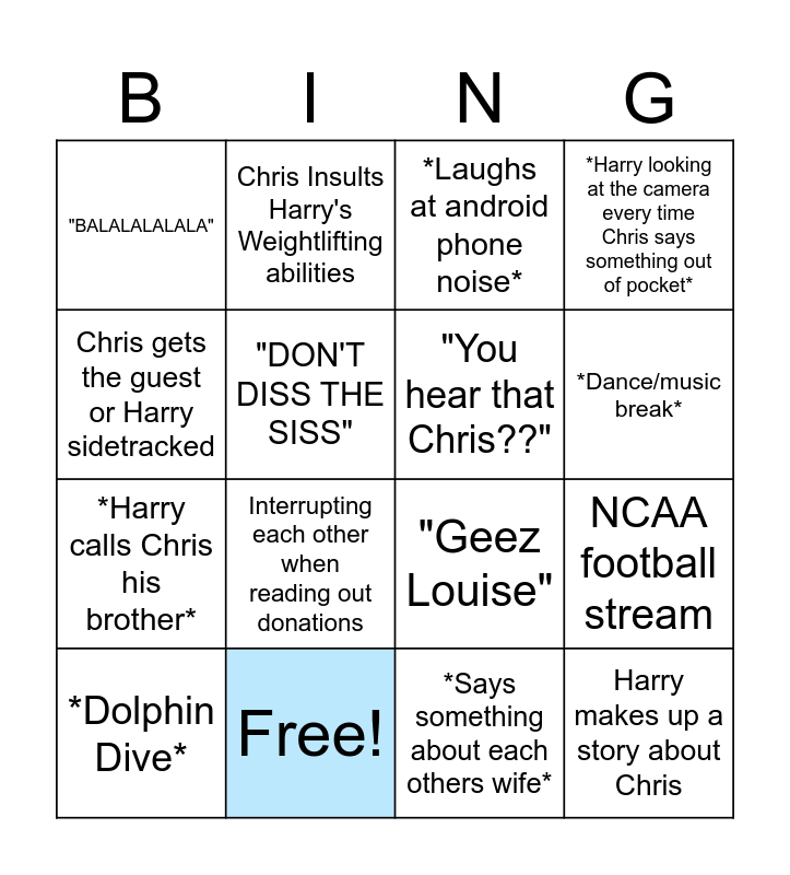 This bingo card has 21 words: Free!, *Insults each other*, Chris Insults Harry's Weightlifting abilities, "SHUT UP JUST STOP TALKING!", *Says something about each others wife*, "You hear that Chris??", "BALALALALALA", *Laughs at android phone noise*, "Geez Louise", *Dance/music break*, *Harry calls Chris his brother*, *Harry looking at the camera every time Chris says something out of pocket*, Harry makes up a story about Chris, "Chris stinks", "DON'T DISS THE SISS", Defending each other from hatters, *Dolphin Dive*, Interrupting each other when reading out donations, Chris gets the guest or Harry sidetracked, NCAA football stream and Chris is just YAPPING.
