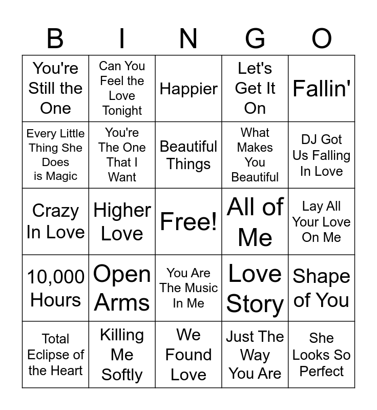 This bingo card has a free space and 24 words: Open Arms, Killing Me Softly, Beautiful Things, Total Eclipse of the Heart, Fallin', You're Still the One, Every Little Thing She Does is Magic, Can You Feel the Love Tonight, All of Me, You Are The Music In Me, What Makes You Beautiful, Crazy In Love, Love Story, Shape of You, You're The One That I Want, Just The Way You Are, Lay All Your Love On Me, Happier, DJ Got Us Falling In Love, Higher Love, She Looks So Perfect, 10,000 Hours, Let's Get It On and We Found Love.