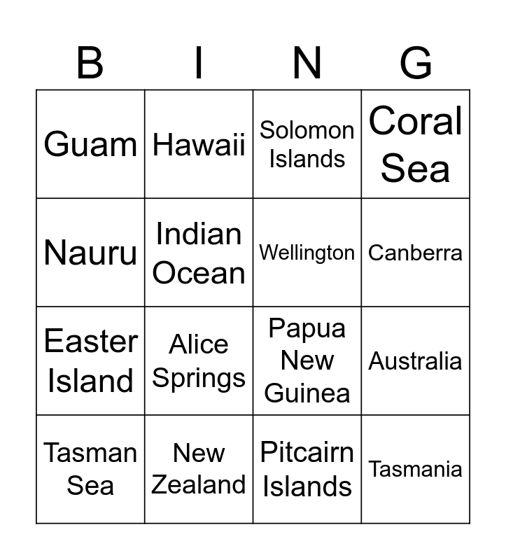 This bingo card has 16 words: New Zealand, Australia, Solomon Islands, Guam, Easter Island, Hawaii, Papua New Guinea, Pitcairn Islands, Nauru, Indian Ocean, Tasman Sea, Coral Sea, Alice Springs, Canberra, Wellington and Tasmania.
