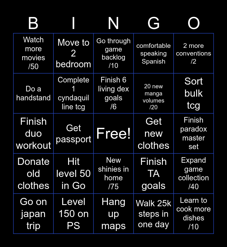 This bingo card has a free space and 24 words: Go on japan trip, Hit level 50 in Go, Finish 6 living dex goals /6, Walk 25k steps in one day, 2 more conventions /2, Watch more movies /50, Move to 2 bedroom, Go through game backlog /10, Get new clothes, Finish paradox master set, Finish duo workout, Complete 1 cyndaquil line tcg, Finish TA goals, Expand game collection /40, Do a handstand, Level 150 on PS, Hang up maps, comfortable speaking Spanish, Sort bulk tcg, Donate old clothes, Get passport, New shinies in home /75, 20 new manga volumes /20 and Learn to cook more dishes /10.