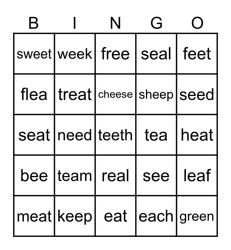 This bingo card has 25 words: team, eat, cheese, meat, feet, sweet, flea, week, tea, real, sheep, seat, see, leaf, treat, green, heat, free, seed, need, teeth, keep, bee, seal and each.