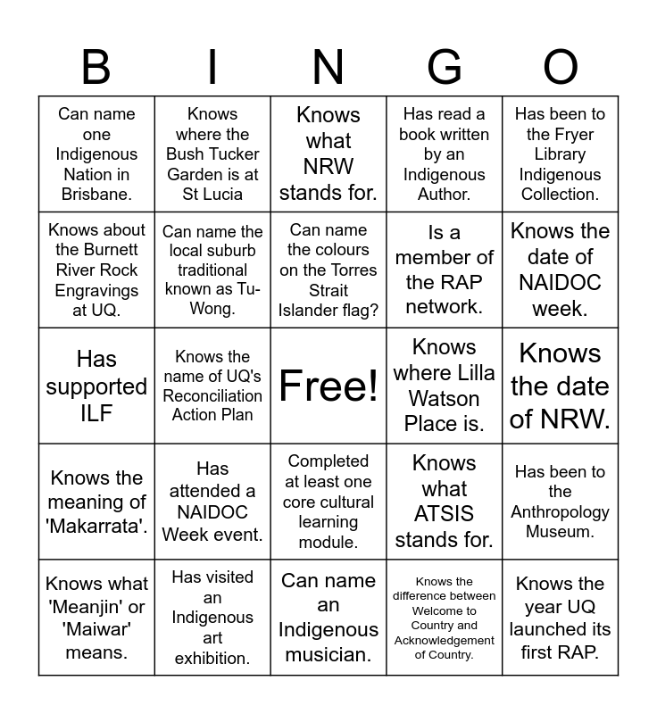 This bingo card has a free space and 24 words: Has attended a NAIDOC Week event., Has visited an Indigenous art exhibition., Can name the colours on the Torres Strait Islander flag?, Knows what 'Meanjin' or 'Maiwar' means., Has been to the Fryer Library Indigenous Collection., Can name one Indigenous Nation in Brisbane., Knows about the Burnett River Rock Engravings at UQ., Knows where the Bush Tucker Garden is at St Lucia, Knows where Lilla Watson Place is., Completed at least one core cultural learning module., Is a member of the RAP network., Has supported ILF, Knows what ATSIS stands for., Has been to the Anthropology Museum., Can name the local suburb traditional known as Tu-Wong., Knows the difference between Welcome to Country and Acknowledgement of Country., Knows the date of NRW., Knows what NRW stands for., Knows the date of NAIDOC week., Knows the name of UQ's Reconciliation Action Plan, Knows the year UQ launched its first RAP., Knows the meaning of 'Makarrata'., Has read a book written by an Indigenous Author. and Can name an Indigenous musician..