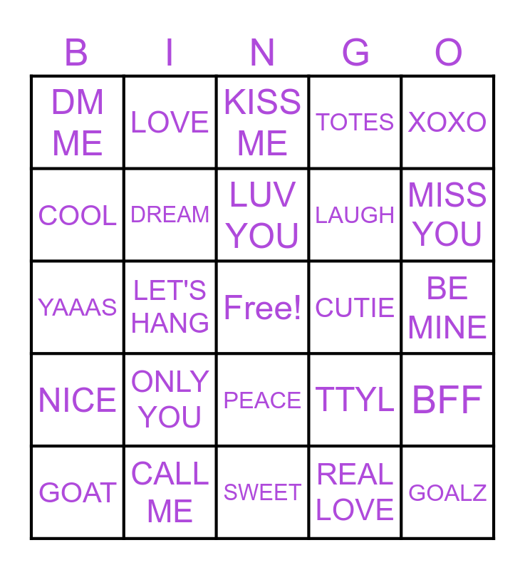 This bingo card has a free space and 24 words: ONLY YOU, CALL ME, LUV YOU, GOAT, XOXO, DM ME, COOL, LOVE, CUTIE, PEACE, LAUGH, YAAAS, TTYL, BFF, DREAM, REAL LOVE, BE MINE, KISS ME, MISS YOU, LET'S HANG, GOALZ, NICE, TOTES and SWEET.