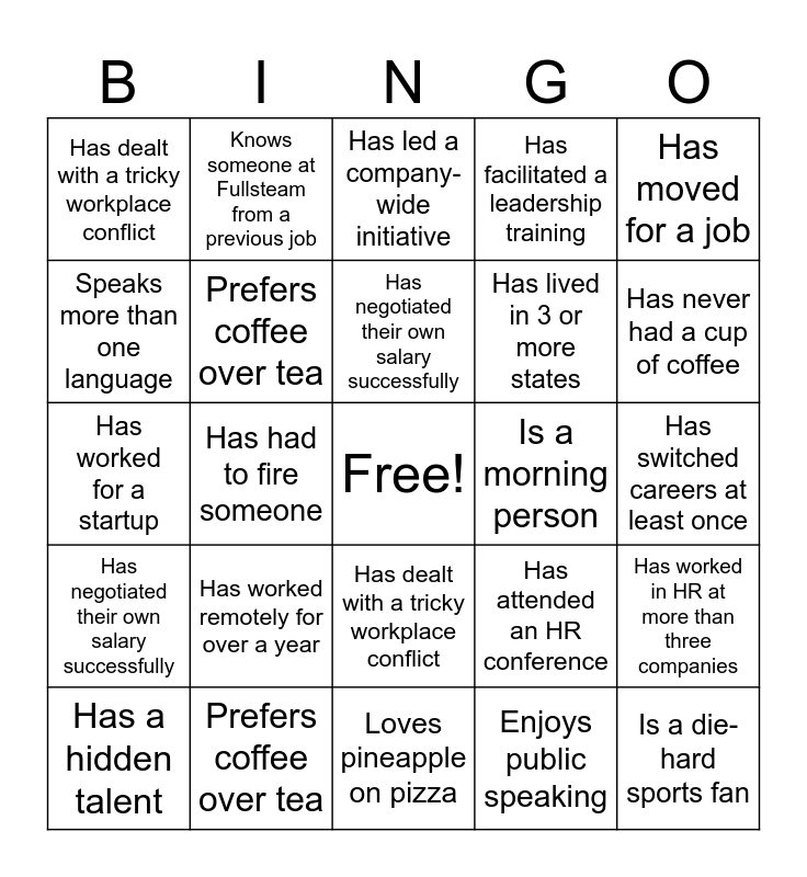 This bingo card has a free space and 79 words: Has worked in HR for over 10 years, Has onboarded more than 50 employees, Has led a company-wide initiative, Has conducted more than 50 interviews, Has worked in HR at more than three companies, Has had to fire someone, Has attended an HR conference, Has worked in payroll before, Knows how to use Salesforce, Has created an employee handbook, Has implemented a new HR system, Has managed employee benefits, Has facilitated a leadership training, Has dealt with a tricky workplace conflict, Has lived in 3 or more states, Speaks more than one language, Has worked in an industry outside of HR, Has worked remotely for over a year, Has worked internationally, Has switched careers at least once, Started their career in a completely different field, Has moved for a job, Has worked for a startup, Has negotiated their own salary successfully, Prefers coffee over tea, Has a pet (dog, cat, or something unusual!), Has completed a marathon or race, Can play a musical instrument, Loves reality TV, Enjoys public speaking, Has never had a cup of coffee, Has been to more than 10 concerts, Loves pineapple on pizza, Has gone skydiving or bungee jumping, Has a hidden talent, Is a morning person, Can juggle or do a cool party trick, Has met a celebrity, Knows how to cook a specialty dish, Is a die-hard sports fan, Has taken a dance class, Loves board games, Has been with Fullsteam for over 3 years, Can name five of Fullsteam’s business units, Has been part of an acquisition or merger, Knows someone at Fullsteam from a previous job, Has worked in HR for over 10 years, Has onboarded more than 50 employees, Has led a company-wide initiative, Has conducted more than 50 interviews, Has worked in HR at more than three companies, Has had to fire someone, Has attended an HR conference, Has worked in payroll before, Knows how to use Salesforce, Has created an employee handbook, Has implemented a new HR system, Has managed employee benefits, Has facilitated a leadership training, Has dealt with a tricky workplace conflict, Has lived in 3 or more states, Speaks more than one language, Has worked in an industry outside of HR, Has worked remotely for over a year, Has worked internationally, Has switched careers at least once, Started their career in a completely different field, Has moved for a job, Has worked for a startup, Has negotiated their own salary successfully, Prefers coffee over tea, Has a pet (dog, cat, or something unusual!), Has completed a marathon or race, Can play a musical instrument, Has taken a dance class, Enjoys public speaking, Has never had a cup of coffee, Has been to more than 10 concerts and Loves pineapple on pizza.