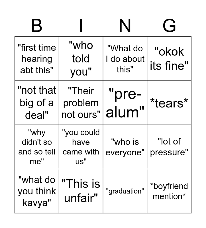 This bingo card has 16 words: "This is unfair", "lot of pressure", "What do I do about this", "first time hearing abt this", "why didn't so and so tell me", "who told you", "who is everyone", "graduation", "not that big of a deal", "Their problem not ours", "what do you think kavya", "okok its fine", "you could have came with us", *tears*, "pre-alum" and *boyfriend mention*.