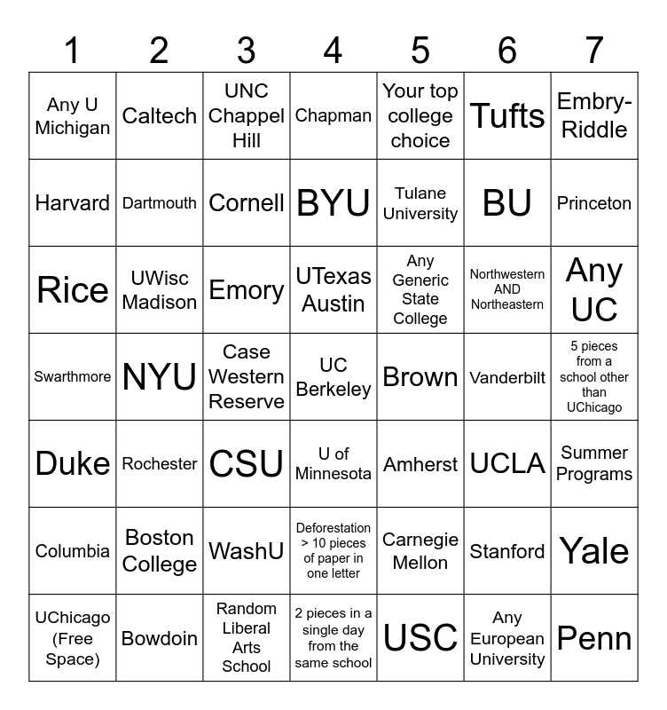 This bingo card has 49 words: Stanford, BU, USC, NYU, Emory, 5 pieces from a school other than UChicago, Caltech, Random Liberal Arts School, Tufts, U of Minnesota, Embry-Riddle, Chapman, Northwestern AND Northeastern, Any Generic State College, Boston College, Vanderbilt, Harvard, Princeton, Yale, Your top college choice, Tulane University, Case Western Reserve, Any U Michigan, Dartmouth, UChicago (Free Space), Cornell, Any UC, Bowdoin, UTexas Austin, UWisc Madison, Penn, Brown, Columbia, WashU, Swarthmore, Amherst, UCLA, Summer Programs, Rice, CSU, Deforestation > 10 pieces of paper in one letter, Duke, UC Berkeley, 2 pieces in a single day from the same school, BYU, UNC Chappel Hill, Carnegie Mellon, Rochester and Any European University.