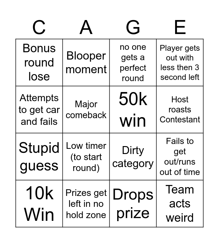 This bingo card has 19 words: 10k Win, the token™, no one gets a perfect round, Fails to get out/runs out of time, Team completes multiple challenges, Blooper moment, Drops prize, Player gets out with less then 3 second left, Bonus round lose, Low timer (to start round), 50k win, Host roasts Contestant, Stupid guess, Prizes get left in no hold zone, Dirty category, Team acts weird, Attempts to get car and fails, Major comeback and Dirty category.