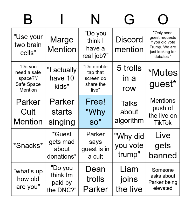 This bingo card has a free space and 33 words: Refers to chat, Trust me bro book, Parker starts singing, "Are you sentient?", *Snacks*, "I actually have 10 kids", "Only send guest requests if you did vote Trump. We are just looking for debates ", "what's up how old are you", Marge Mention, *Uses Maga Man Voise*, "Do double tap that screen do share the live", "Do you think I have a real job?", Face Zoom, Crashout, Talks about algorithm, *Mutes guest*, "Do you think Im paid by the DNC?", Parker Cult Mention, *Guest gets mad about donations*, "Why did you vote trump", Parker says guest is in a cult, "Im losing brain cells", "Use your two brain cells", Mentions push of the live on TikTok, Dean trolls Parker, Someone asks about Parker being elevated, Discord mention, 5 trolls in a row, "Do you need a safe space?"/ Safe Space Mention, Live gets banned, Liam mention, Liam joins the live and crashout.