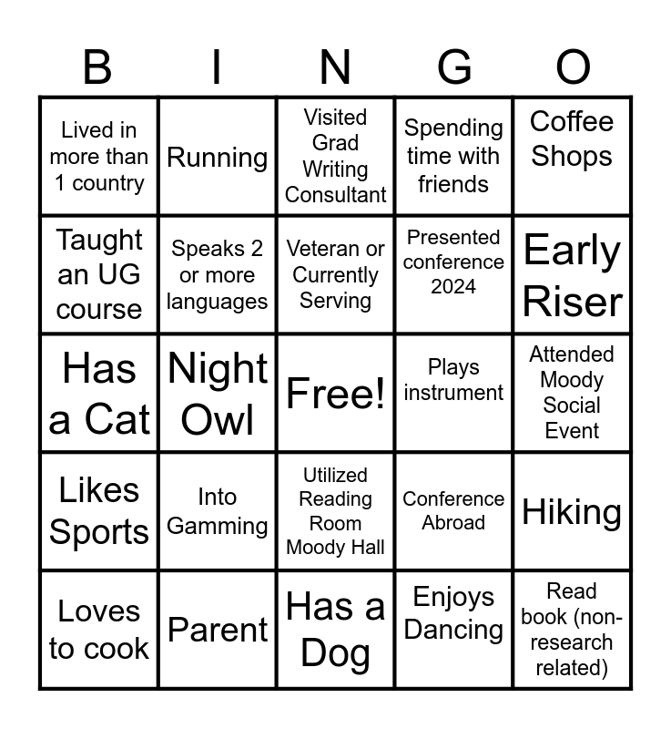 This bingo card has a free space and 24 words: Into Gamming, Parent, Veteran or Currently Serving, Loves to cook, Coffee Shops, Lived in more than 1 country, Taught an UG course, Running, Plays instrument, Utilized Reading Room Moody Hall, Presented conference 2024, Has a Cat, Conference Abroad, Hiking, Speaks 2 or more languages, Enjoys Dancing, Attended Moody Social Event, Visited Grad Writing Consultant, Early Riser, Night Owl, Read book (non-research related), Likes Sports, Spending time with friends and Has a Dog.