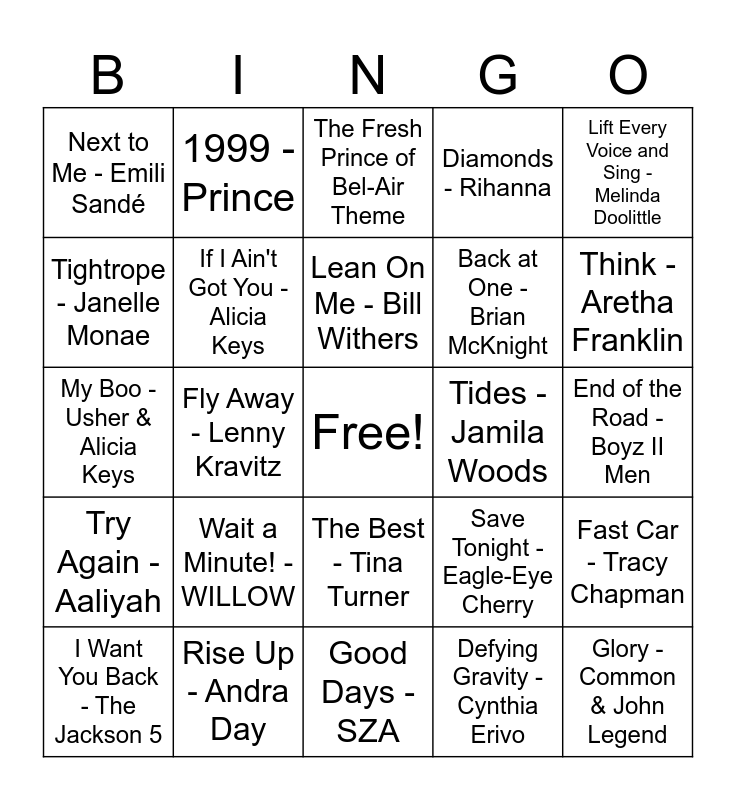 This bingo card has a free space and 74 words: Crazy In Love - Beyoncé, Jay-Z, The Entertainer - Scott Joplin, The Fresh Prince of Bel-Air Theme, All Along the Watchtower - Jimi Hendrix, What a Wonderful World - Louis Armstrong, Dream a Little Dream of Me - Ella Fitzgerald, Blinding Lights - The Weeknd, Midnight Train to Georgia - Gladys Knight & The Pips, I Want You Back - The Jackson 5, Old Town Road - Lil Nas X, Giant Steps - John Coltrane, Three Little Birds - Bob Marley & The Wailers, Lean On Me - Bill Withers, Tightrope - Janelle Monae, Happy - Pharrell, Fly Away - Lenny Kravitz, I Got You (I Feel Good) - James Brown, Think - Aretha Franklin, Sir Duke - Stevie Wonder, My Boo - Usher & Alicia Keys, If I Ain't Got You - Alicia Keys, 1999 - Prince, Diamonds - Rihanna, Ex-Factor - Ms. Lauryn Hill, Glory - Common & John Legend, Man In the Mirror - Michael Jackson, Caught Up - Usher, I Wanna Dance with Somebody - Whitney Houston, Beyond - Leon Bridges, Hard Place - H.E.R., Lift Every Voice and Sing - Melinda Doolittle, Where or When - Wynton Marsalis, Ain't Too Proud to Beg - The Temptations, All the Stars - Kendrick Lamar, SZA, Hey Ya! - Outkast, Defying Gravity - Cynthia Erivo, September - Earth, Wind, & Fire, (Sittin' On) the Dock of the Bay - Otis Redding, I am Light - India.Arie, Only Wanna Be with You - Hootie & the Blowfish, Good Days - SZA, Rise Up - Andra Day, Weight in Gold - Gallant, FREEDOM - Jon Batiste, Bust Your Windows - Jazmine Sullivan, Next to Me - Emili Sandé, Lost Boy - Ruth B., Wait a Minute! - WILLOW, Without You - Leslie Odom Jr., Blessings - Chance the Rapper, Silence - Khalid, Best Part - Daniel Caesar, H.E.R, End of the Road - Boyz II Men, I'd Rather Go Blind - Etta James, Smile - Nat King Cole, Georgia On My Mind - Ray Charles, The Best - Tina Turner, Come Back - Trombone Shorty, A Song for You - Donny Hathaway, Fast Car - Tracy Chapman, Back at One - Brian McKnight, One Thing Right - Kane Brown, Try Again - Aaliyah, The Day That You Begin - Stephanie Anne Johnson, Tides - Jamila Woods, Cry, Cry, Cry - Judith Hill, Never Too Much - Luther Vandross, Jealous - Labrinth, Save Tonight - Eagle-Eye Cherry, Don't Worry Be Happy - Bobby McFerrin, Family Affair - Mary J. Blige, The Boy Is Mine - Brandy, Monica, Bring It All to Me - Blaque and Special - Lizzo.