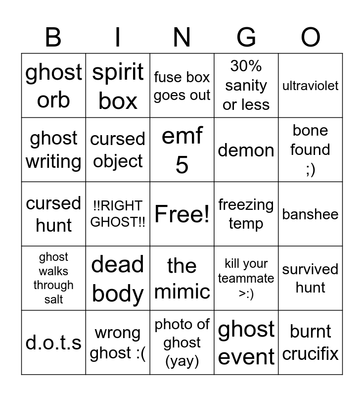 This bingo card has a free space and 24 words: dead body, wrong ghost :(, emf 5, d.o.t.s, ultraviolet, ghost orb, ghost writing, spirit box, freezing temp, the mimic, demon, cursed hunt, kill your teammate >:), survived hunt, cursed object, ghost event, banshee, fuse box goes out, bone found ;), !!RIGHT GHOST!!, burnt crucifix, ghost walks through salt, 30% sanity or less and photo of ghost (yay).