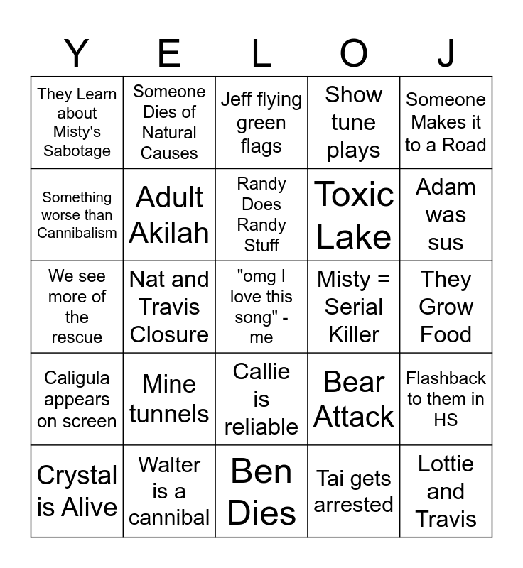 This bingo card has 25 words: Mine tunnels, Ben Dies, Randy Does Randy Stuff, Crystal is Alive, Someone Makes it to a Road, They Learn about Misty's Sabotage, Something worse than Cannibalism, Someone Dies of Natural Causes, Misty = Serial Killer, Callie is reliable, Toxic Lake, We see more of the rescue, Bear Attack, Flashback to them in HS, Adult Akilah, Lottie and Travis, They Grow Food, Jeff flying green flags, Adam was sus, Nat and Travis Closure, "omg I love this song" - me, Walter is a cannibal, Caligula appears on screen, Show tune plays and Tai gets arrested.