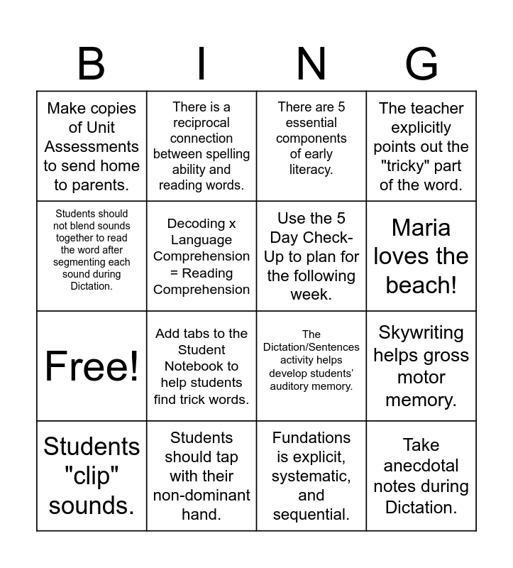 This bingo card has 20 words: Skywriting helps gross motor memory., Letter tiles require less working memory than Dictation., There are 5 essential components of early literacy., Maria has 3 boys., Students "clip" sounds., Students should not blend sounds together to read the word after segmenting each sound during Dictation., Students should tap with their non-dominant hand., Make copies of Unit Assessments to send home to parents., Free!, There is a reciprocal connection between spelling ability and reading words., Add tabs to the Student Notebook to help students find trick words., The Dictation/Sentences activity helps develop students’ auditory memory., Decoding x Language Comprehension = Reading Comprehension, Take anecdotal notes during Dictation., Use the 5 Day Check-Up to plan for the following week., "Word of the Day" weaves in vocabulary., Maria loves the beach!, The teacher explicitly points out the "tricky" part of the word., Fundations is explicit, systematic, and sequential. and Students should always "touch the text" with their dominant finger..