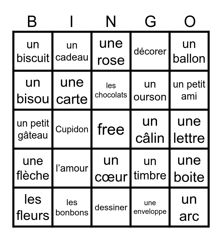 This bingo card has a free space and 24 words: l’amour, les bonbons, les chocolats, les fleurs, un ballon, un biscuit, un bisou, un cadeau, un câlin, un cœur, un ourson, un petit gâteau, un timbre, une boite, une carte, une enveloppe, une lettre, une rose, un petit ami, Cupidon, un arc, une flèche, décorer and dessiner.