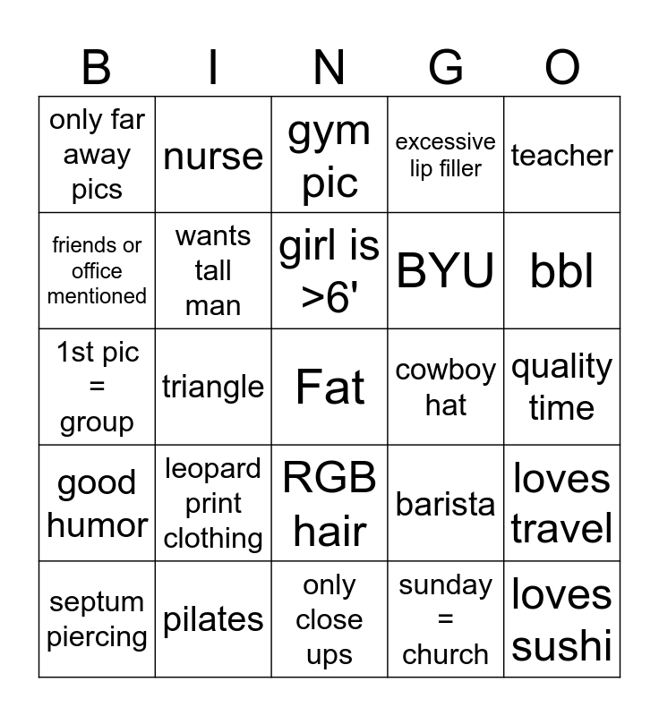This bingo card has a free space and 24 words: leopard print clothing, pilates, girl is >6', septum piercing, teacher, only far away pics, friends or office mentioned, nurse, cowboy hat, RGB hair, BYU, 1st pic = group, barista, loves travel, wants tall man, sunday = church, quality time, gym pic, bbl, triangle, loves sushi, good humor, excessive lip filler and only close ups.