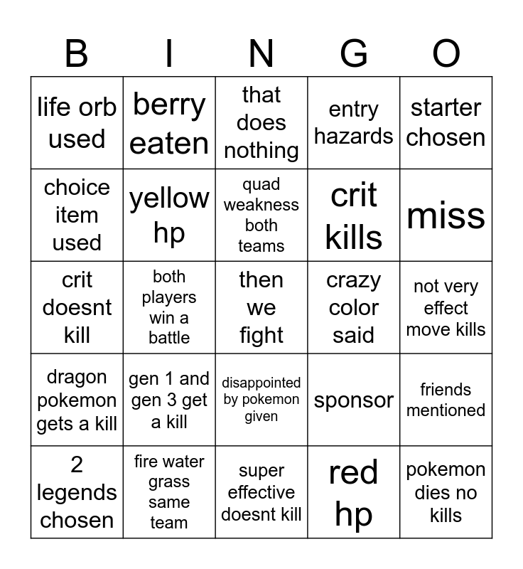This bingo card has a free space and 24 words: gen 1 and gen 3 get a kill, fire water grass same team, quad weakness both teams, 2 legends chosen, starter chosen, life orb used, choice item used, berry eaten, crazy color said, disappointed by pokemon given, crit kills, crit doesnt kill, sponsor, friends mentioned, yellow hp, red hp, not very effect move kills, that does nothing, miss, both players win a battle, pokemon dies no kills, dragon pokemon gets a kill, entry hazards and super effective doesnt kill.
