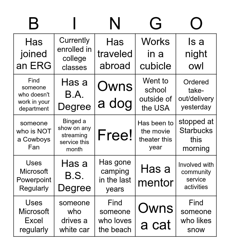 This bingo card has a free space and 34 words: Used TikTOK today, Owns a cat, Grew up in a different state other than TX, loves the outdoors, Uses Microsoft Powerpoint Regularly, Has a B.A. Degree, Is a night owl, Uses Microsoft Excel regularly, Currently enrolled in college classes, Been to Disneyland, Owns a dog, Has traveled abroad, someone who doesn't have TikTok, Currently studying for certification exam, Has been to the movie theater this year, Ordered take-out/delivery yesterday, someone who drives a white car, someone who is NOT a Cowboys Fan, Has a B.S. Degree, Has a mentor, Has gone camping in the last years, Has 3 or more pets, Has joined an ERG, stopped at Starbucks this morning, Find someone who loves the beach, Find someone who likes snow, Works in a cubicle, Is proficient in multiple languages, Went to school outside of the USA, Find someone who doesn't work in your department, talk to someone new, Binged a show on any streaming service this month, Involved with community service activities and Find someone who runs for fun.